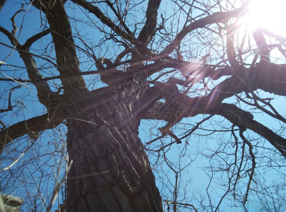 老槐树是我家门口的老槐树。小时候不止一次地问过家里的长辈,这棵树有多老啦,是谁栽在这里的,却总也没人准确地回答过。老槐树其实并不特别“老”,甚至都没有南山庙门前的橡树粗,但从我记事开始,几乎每天都能看到她,一年又一年,看着她抽芽、长叶、开花、然后落叶,周而复始,默默地守护着我的家。老槐树是一棵国槐,她的花朵没有洋槐的洁白颜色,也没有洋槐的甜香气味,但她的花苞,即槐米,却可入药。记得小时候,五六月份天气渐热,槐米成形,经常是父亲在树上,一家人围在树下择槐米,邻居家的老八路也经常来帮忙,一边干活,一边讲些他年轻时参军打仗的旧事。再过两三个月,老槐树的叶子长到最茂盛的时候,每天下午西斜的太阳总能使树叶的荫凉笼罩住整个院子,这个时候在院子里玩耍最是惬意不过了。老槐树的叶子落的早,还未到冬天就只剩光秃秃的枝干了,树冠枝杈很多,整个冬天都沉默地为来年积蓄着力量。不过碰上下雪的时候,每一条枝干上都堆积着一层白雪,远远望去像巨大的白色珊瑚,倒是别有一番趣味。去年冬天我曾把积雪的老槐树照片发给朋友,得到评曰“一不小心到白头”,细看之下,果真有几分意思。
