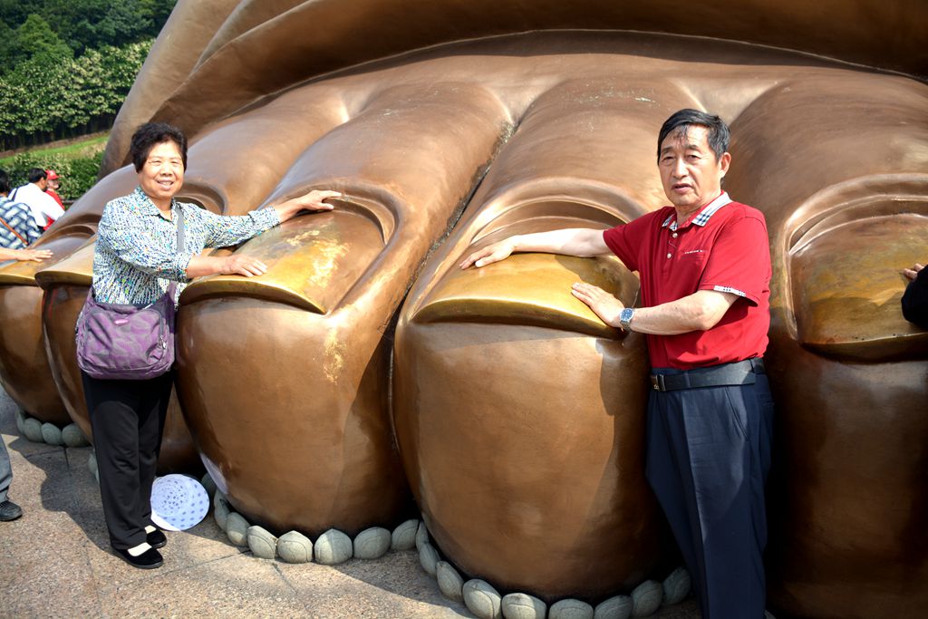 在无锡灵山,抱佛脚也不容易,得坐十几层电梯才能上去呢。