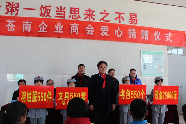 北京苍南企业商会会长方钦佩发言,深切表达了对老区教育的关爱之情,他代表商会向学校捐赠价值14.5万元的羽绒服、文具等物资和2.5万元现金。狼牙山小学向北京苍南企业商会回赠了锦旗。