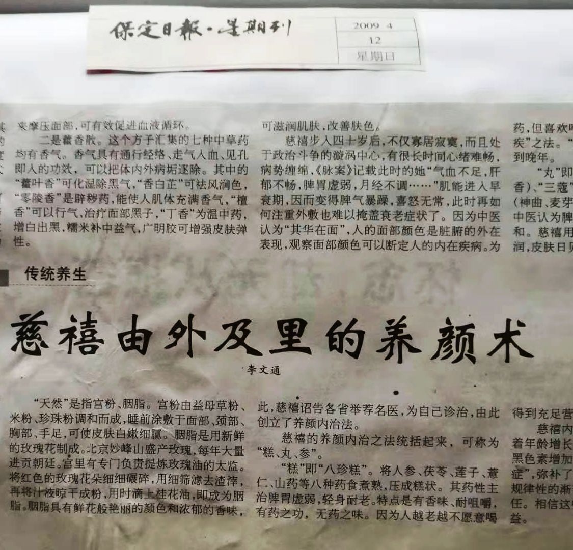慈禧内外相重的养颜疗法,有效预防了随着年龄增长血液循环变缓、皮肤变黄变灰、体内黑色素增加、皮肤弹性降低而形成皱纹的“衰老症”,弥补了容颜不俏的先天不足,迟缓了后天规律性的渐衰。其中关键一环是她对中药的信任。相信这些古老验方对当今美容界能有所裨益。
