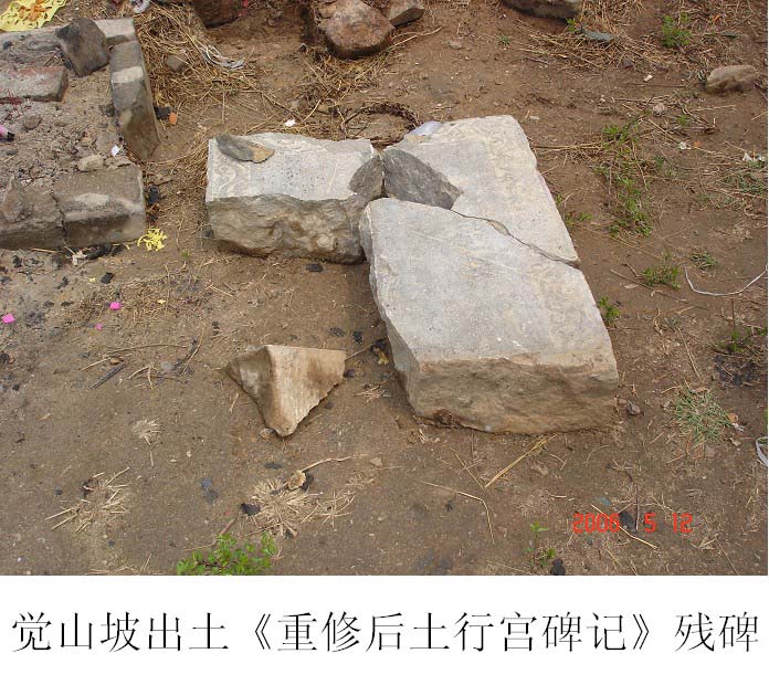 行宫是古代京城以外供帝王出行时居住的宫室,辽代以前的行宫,已无法考证。后山有没有历代帝王朝拜时的行宫呢?2004年2月在易县觉山(县城北一公里)出土一残缺石碑,碑文记载了兴修后土行宫记的部分铭文:“封又密……行并陈请……不特善男……数年来的道途……瞻拜遥……难考信而辽金文以来庙貌重修……住……绝有识者集焉,忧之思欲挽救……咸宜耳……次事变吾华旧