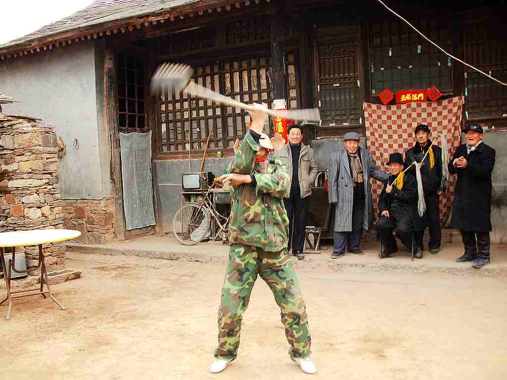 塘湖村高跷花会会长滑伯英老人在表演传统民间棍术。