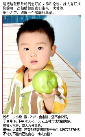 姓名:宁小松,男, 2岁。会走路,还不会说话。