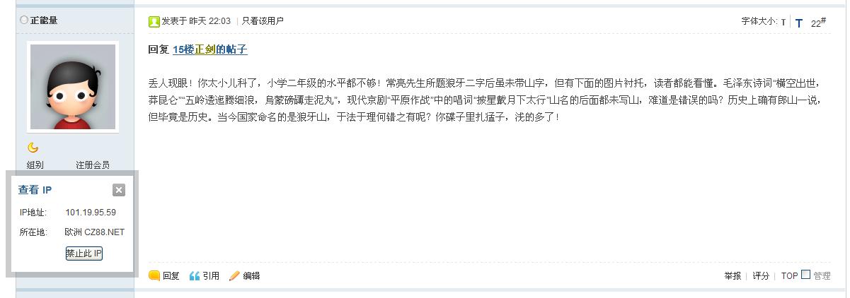 不能提一点不好,否则就跳,就给别人压帽子定调子。颇有文革遗风。做人谦逊些没甚不好,在网上玩,要有个好心态。错了改,不认错说明理由。百家争鸣就是这个道理。很没必要用克隆术护身。这里高手云集,譬如醉龙兄就善于捉鬼剥画皮。 文通 发表于 2014/1/11 19:46:54