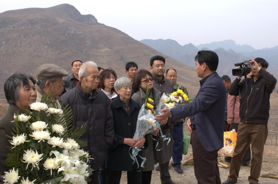 【村长(右2)向烈士亲属们介绍村里的发展和改革开放的成果。河北电视台记者也来到现场】