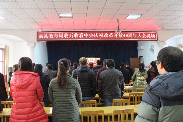 2018年12月18日上午10点,中共中央、国务院在人民大会堂召开庆祝改革开放40周年大会,中共中央总书记、国家主席、中央军委主席习近平出席大会并发表重要讲话。易县教育局党组高度重视,根据易县县委办公室《关于组织收听收看中央庆祝改革开放40周年大会和中宣部等部门庆祝改革开放40周年大型文艺晚会的通知》的部署要求,明确专人,具体负责,组织局班子成员、机关全体在局平房会议室收听收看大会盛况。按照文件要求,12月底前局理论学习中心组专题学习习近平总书记在大会上的重要讲话精神,并结合工作实际深入探讨,深刻领会讲话的精神实质,将学习贯彻讲话精神落实到具体行动上,做到学在前、用在前、走在前。