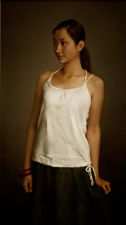 周丽萱所学得的这些技法,结合自己的个性和修养,自然地在作品中流露出某些古典的韵味。与古典韵味相协调的还有一种怀旧的情愫,这不仅仅表现在她的戏服人物和过去时代服装人物的肖像作品中,即使画的是当代人物,身着现代服饰,我们依然可以在作品中感受到那种在已经远去的时代的淡淡的感伤。里面蕴含说不清的气息,是感时伤事?是闺房幽怨?还是异乡的离愁?或许都不是,仅仅是对旧时事物的眷恋和偏爱而已。
