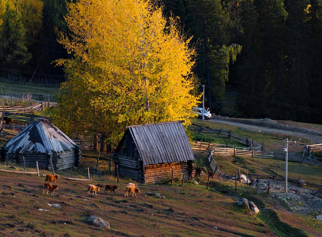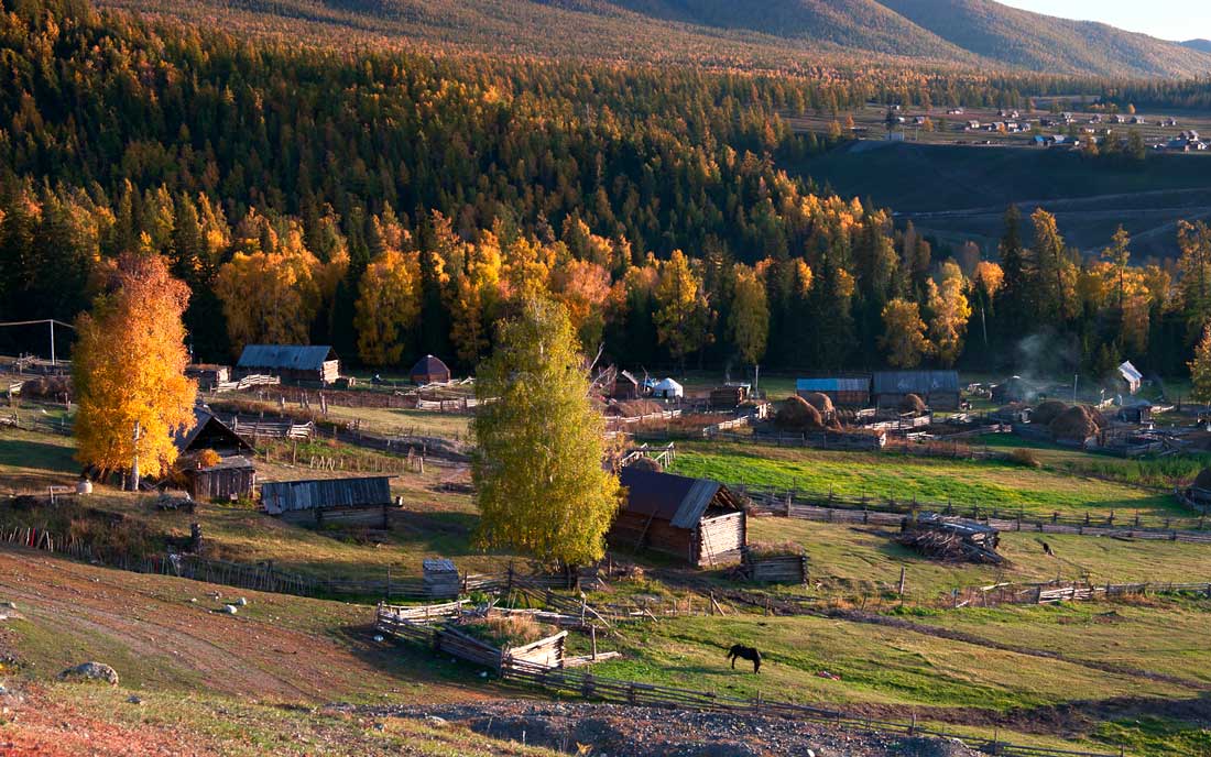 白哈巴村以图瓦人为主,位于阿尔泰山山脉的山谷平地上,与哈萨克斯坦的大山遥遥相望,阿尔泰山上密密麻麻的金黄金黄的松树林一直延伸到白哈巴村里,村民住的木屋和圈养牲畜的栅栏错落有致地散布在松林和桦林之中,安宁、祥和。